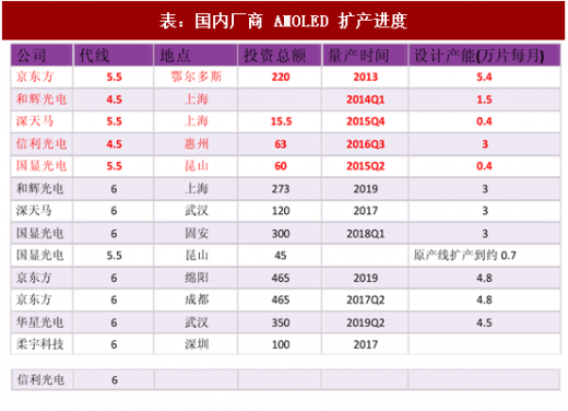 苹果为 iphone 8 采用 oled 屏幕,并且预计在 2019 年全面转向 oled 屏。苹果的设计总会引领业界争相效仿并成为“标配”,并显著加快其他竞争对手采用这种屏幕技术的步伐。预计到 2020 年末时,将会有 50% 的智能手机采用 oled 屏幕技术。三星调整了 fab 计划,将新建成 ltps 面板工厂改造用于生产 amoled 面板。国内面板厂商也分别从 2015-2016 年大规模启动 amoled 产能的建设。