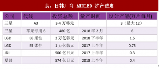 按照目前预测的 amoled 产能扩产进度,预计 2017-2019 年全球扩产产线投资高峰逐渐来临,产能 2019 年后开始集中释放。按国产企业产线投资额平均计算每万平米 3 亿元投资测算,未来四年全球 amoled 产线投资平均每年需要 1575 元,中国 amoled 产线投资平均每年需要 550 亿元。amoled 产线投资 75%左右都是设备投资,未来四年每年平均 amoled 设备投资 400 亿元。