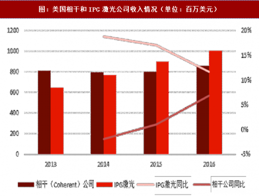 图:美国相干和ipg激光公司收入情况(单位:百万美元)