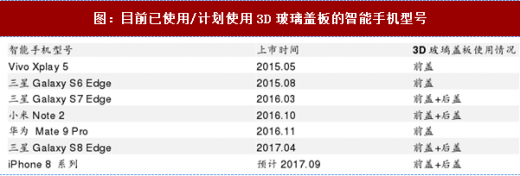 图:目前已使用/计划使用3d玻璃盖板的智能手机型号