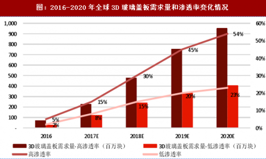 图:2016-2020年全球3d玻璃盖板需求量和渗透率变化情况