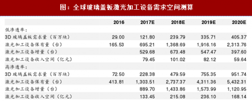 2020年全球3d玻璃新增激光加工设备需求空间在60亿至170亿元之间。重点假设: