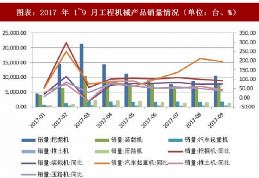 进入 2017 年,我国工程机械行业景气度持续提升。1~9 月,全国挖掘机销量达到 101,934 台,同比增长 100.15%;装载机销量达到 66,924 台,同比增长 46.23%;汽车起重机销量达到 14,246 台,同比增长 114.23%;推土机销量达到 4,504 台,同比增长 39.66%;压路机销量达到 13,967 台,同比增长 49.89%。