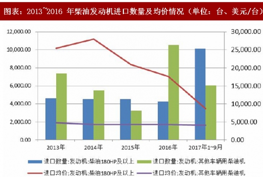2016 年,柴油 180hp 以上发动机进口金额为 7,443.07 万美元,进口数量为 4,236 台。2017 年 1~9 月,工程机械行业的回暖也带动了柴油发动机进口量的迅速回升,前三季度累计实现进口数量 10,109 台,较上年同期增长 138.64%;实现进口金额 8,812.07 万美元,较上年同期增长 18.39%。产品价格方面,受行业竞争激烈影响,近年来柴油 180hp 及以上发动机进口均价出现明显下滑,截至 2017 年 9 月底,柴油 180hp 及以上发动机进口均价仅为 8,717.05 台/美元。目前,国内工程机械主要使用的柴油机海外供应商有康明斯、道依茨、珀金斯(已被卡特彼勒收购)等。