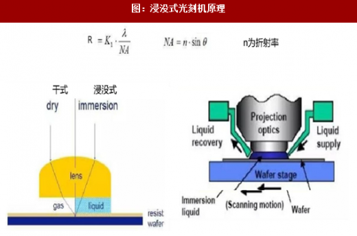 创新三:浸没式光刻系统。到了45nm制程节点时,arf光刻机也遇到了分辨率不足的问题,此时业内对下一代光刻机的发展提出了两种路线图。一是开发波长更低的157nmf2准分子激光做为光源,二是由2002年台积电林本坚提出的浸没式光刻。此前的光刻机都是干式机台,曝光显影都是在无尘室中,以空气为媒介进行。由于最小分辨率公式中的na与折射率成正相关,如果用折射率大于1的水做为媒介进行光刻,最小分辨率将得到提升,这就是浸没式光刻系统的原理。