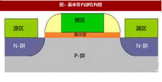 半导体芯片具有不同的制程,即不同的技术节点,经常看到的45nm、28nm、10nm等字样即是对不同制程的描述,那么不同的制程该如何理解,不同制程的芯片又有何差异呢?这要从集成电路的最基本单元——晶体管说起,用半导体制造晶体管是利用其特殊的导电能力来传递0或1的数字信号。晶体管的内部结构图如下图所示,在栅区不通电的情况下,源区信号很难穿过不导电的p型衬底到达漏区,即表示电路关闭(数字信号0),如果在栅区和衬底间加上电压,衬底中的电荷就会在异性相吸的作用下在绝缘氧化层下大量聚集,形成一条细窄的导电区,使得源区和漏区导通,电流就可以顺利从源区传递到漏区(信号1),这就是晶体管最基本的工作原理。而栅极下方两个n—阱间的距离,即导电沟道的长度,被定义为晶体管的尺寸。