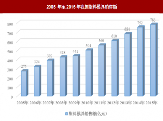 根据成型材料不同,模具分为金属模具和非金属模具,非金属模具中的塑料模具占模具行业总产值的45%以上,成为最主要的一种模具产品。2005 年至2015年,我国塑料模具销售额由275 亿元增长至783 亿元,年复合增长率约10%。