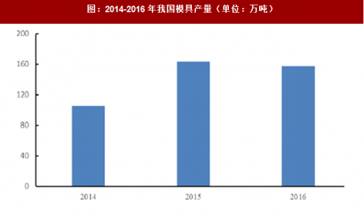 2014 年至2016 年我国模具产量稳中有升,2015 年在国家一系列政策密集出台和国内市场强劲需求的推动下,模具产量较2014 年大幅上升,2016 年产量与2015 年相近,具体如下: