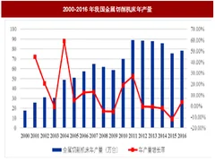 受全社会固定资产投资增速影响,2000 年至2016 年,金属切削机床年产量由17.66 万台增长至78.32 万台,年复合增长率约9.75%。从增长曲线看,我国金属切削机床的生产量呈现明显的周期性变化。2007 年至2011 年年产量增长率呈现“u”字型态势,整体产量在2011 年达到新高。2012 年至2015 年年产量和增长率持续下降,2016 年产量上升至78.32 万台,较2015 年产量上升了约3.74%。