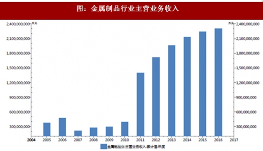 近年来,我国通过不断引进吸收国外先进技术和自主创新,逐渐发展成为制造业大国,尤其通讯、电子、医疗、能源、机床、航天航空等行业对高端精密金属产品需求急速增长,促使了上游精密金属制造等行业的迅速发展,从主营业务收入的角度看,2005-2016 年呈现持续增长的趋势。2014 年度至2016 年度,增长率分别为8.67%、4.99%和3.02%。