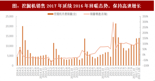 2017年延续2016年回暖态势,挖掘机库存加速出清,多地区出现供不应求的火爆场面。根据工程机械协会挖掘机分会数据,2017年1~11月纳入统计的25家主机制造企业,共计销售各类挖掘机械产品126,298台,同比涨幅99.2%。其中国内市场销量(不含港澳台)117,837台,同比涨幅107.6%。出口销量8,400台,同比涨幅27.5%。其中11月销售13,822台,同比增长107.4%,总体可以概括为淡季不淡,频超预期。