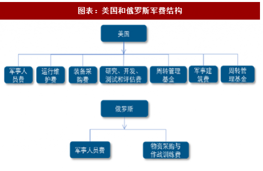 各国军费结构划分不同,本质相似。根据《2010 年中国的国防》白皮书,中国国防费主要由人员生活费、训练维持费和装备费 3 部分组成,各部分约各占三分之一。人员生活费:用于军官、文职干部、士兵和聘用人员的工资津贴、住房保险、伙食被装等;训练维持费:用于部队训练、院校教育、工程设施建设维护以及其他日常消耗性支出;装备费:用于武器装备的研究、试验、采购、维修、运输和储存等。