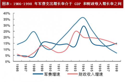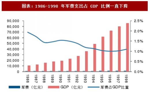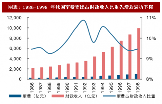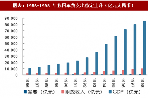 阶段二:1986-1998 年,是我国军费的稳定增长期。这段期间,经济发展进入高速增长期,军费支出随之有所增长,增长率介于 gdp 增长率及财政收入增长率之间。军费支出从 1986 年的 200.75 亿元上升至 1998 年的 934.7 亿元。但从相对占比来看,军费支出占财政支出的比例经历了一个相对上升又回落的阶段,1986 年军费支出占财政收入比例为 9.46%,1992 年达到该期间最高点 10.85%,后又回落到 1998 年的 9.46%。而军费支出占 gdp 比例则一直下降,直至 1996 年达到最低点 1%。