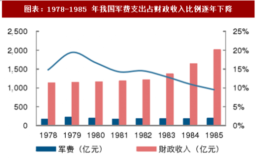 阶段一:1978-1985 年,是我国军费发展的相对衰退期。1978 年召开的十一届三中全会强调“以经济建设为中心”,奠定了发展的主基调。在这段期间,我国经济发展刚进入起步阶段,因此国家财政支出仍以促进国民经济增长为主要目的。的指导思想也是首要服从经济建设,在这一时期国防经费总额明显下降,从 1979 年的 222.64 亿元下降至 1985 年的 191.53 亿元。与此同时,军费支出占国家财政收入比重也明显下滑,从1978 年的 14.82%下降到 1985 年的 9.55%,军费支出占 gdp 的比例也由 1978 年的4.56%下降到 1985 年的 2.1%。