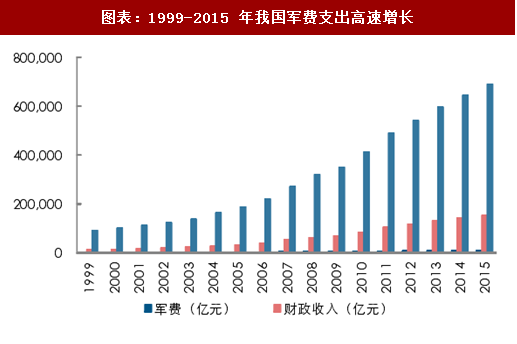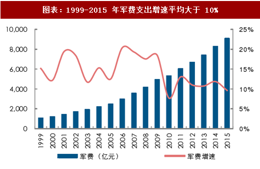 阶段三:1999-2015 年,是我国军费发展的高速增长期。相比于不断扩大的中国经济总量规模,中国军费支出相对较低,国防基础建设仍存在薄弱环节,因此在这个阶段,我国的军费支出进入了“补偿性”快速增长。军费支出总额持续迈上新台阶,2004 年超过 2000 亿元,2010 年超过 5000 亿元,2015 年达到 9087.84 亿元,年增长速度平均保持在两位数以上。