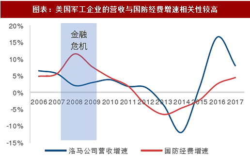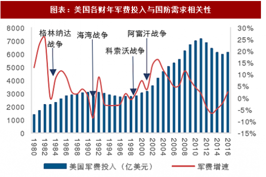 军费增速与行业整体增速相关性较高,美国历次战争都会催生军费暴增。军工行业作为采购方单一的特殊性行业,公司增速受国防经费增速及国防侧重的影响较为明显,军费增速对行业整体增速产生正影响。以美国为例,其历次国家发动战争都会催生军费开支增速提升,同时也会影响到相关军工企业的营收及增速。