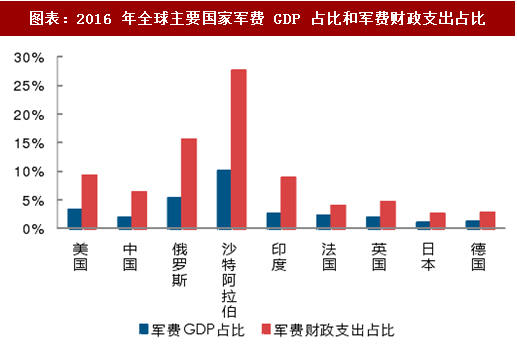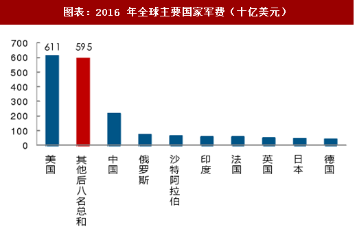美国军费领先于其他国家,牢牢占据全球榜首。sipri 的统计数据显示,2016 年美国军费支出已达到 6110 亿美元,俄罗斯军费支出为 692 亿美元,沙特阿拉伯军费支出为 637 亿美元,该统计口径下的中国军费支出也仅为 2150 亿美元,美国军费已超过中国等其他 8 国军费之和。此外,美国军费占世界军费支出比接近于 40%。无论是从相对规模还是绝对规模上,美国军费远远领先于其他国家。
