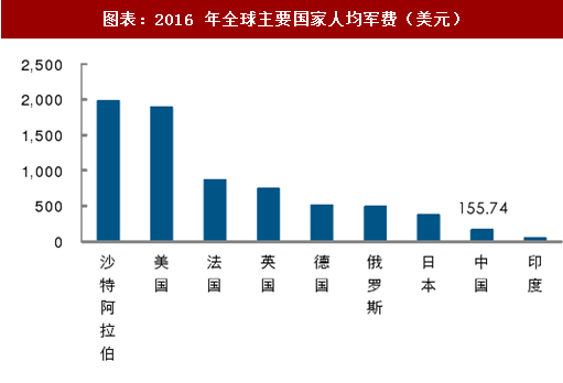 沙特阿拉伯在人均军费、军费 gdp 占比及军费财政支出占比中位居第一,美国排名靠前,而中国排名较低。在人均军费上,沙特阿拉伯和美国是仅有的超过 1000 美元的国家,其中,2016 年沙特阿拉伯和美国人均军费接近于 2000 美元,高于其他军事强国;在军费 gdp 占比和军费财政支出占比上,沙特阿拉伯仍位列第一,而中国占比较低,尤其是军费 gdp 占比,明显低于其他国家。