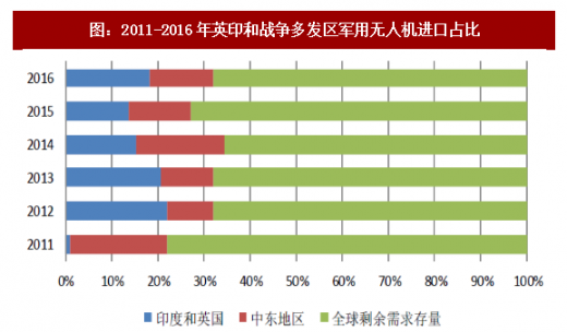 图:2011-2016年英印和战争多发区军用无人机进口占比
