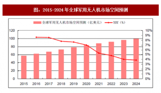 根据中投顾问《2016-2020年中国军工产业深度调研及投资前景预测报告》,全球无人机需求将由2015年的64亿美元增至2024年的115亿美元,复合增长率为6.7%。2015年至2024年,全球军用无人机支出总额由57亿美元增加到99亿美元,复合增速6.33%,支出总额将达810亿美元。预计到2024年全球军用无人机将占当年市场总额86%(99亿美元),民用无人机占14%(16亿美元)。