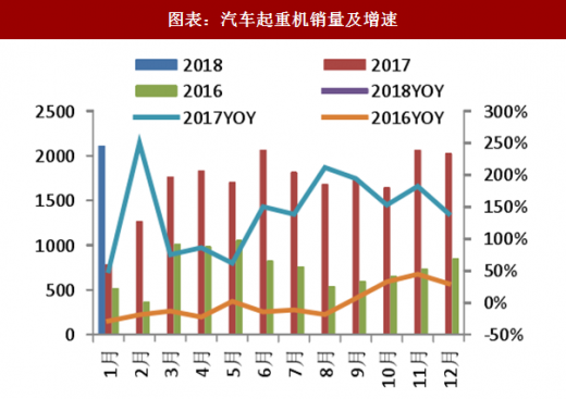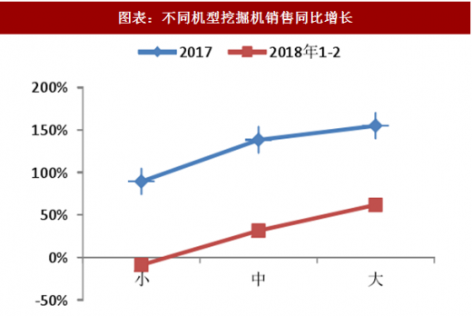 2018 年 2 月份挖掘机销售 11113 台,略好于市场预期。由于今年 2 月份为春节,数据有所钝化,我们叠加 1 2 月份数据来分析。2018 年 1-2 月份挖掘机 21800 台。同比增长 14.3%,国内销量 19270 台,同比增长 7.9%,出口 2524 台,同比增长 108.3%。分产品结构来看:其中大挖(≥30t)销售 3473 台,同比增长 61.8%;中挖(20~30t)销售 4849 台,同比增长 31.4%;小挖(<20t)销售 10948 台,同比增长-8.9%。