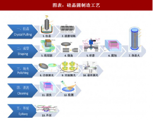 晶圆上游硅晶圆供需不匹配,国内加紧布局。作为晶圆厂上游的原料,目前全球的产能主要由五大金刚把控,其中日本信越半导体占比 27%、日本胜高科技占比 26%,台湾环球晶圆占比 17%,德国 silitronic 占比 13%,韩国 lg 占比 9%。中国国内硅晶圆产能缺失,供需矛盾下,国内加紧布局。