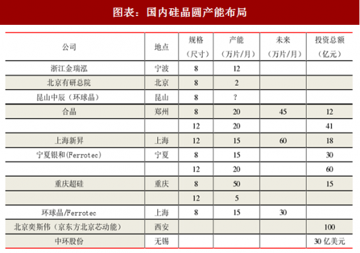 目前国内在建或者计划建设的硅晶圆项目包括浙江金瑞泓(8 寸)、北京有研总院(8 寸)、昆山中辰(8 寸)、郑州合晶(8 寸、12 寸)、上海新昇(12 寸)、宁夏银和(8 寸、12 寸)、重庆超硅(8 寸、12 寸),未来随着这些项目的落地量产,硅晶圆国产化渐行渐近。根据我们对国内在建或者计划建设的晶圆厂的统计,8 寸晶圆的产能为 100 万片/月,12 寸晶圆的产能为 127 万片/月,目前作为晶圆上游的硅晶圆的全球 92%供应由日本信越、胜高、德国 silitronic、台湾环球晶圆、南韩 lg 五大企业把控,中国硅晶圆的产能供需矛盾未来将越发突出。我们认为在下游旺盛需求的推动下,未来硅晶圆的投资还将持续的投入,硅晶圆的国产化破局,将为国产硅晶圆装备企业带来机遇。硅晶圆供需矛盾突出,国内国产化破局持续,未来硅晶圆有望成为晶圆投资热以后的第二个半导体投资热土。