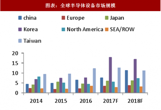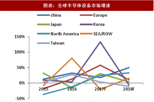 2018 年中国将成为全球增速最快的半导体设备市场。根据 semi 的数据,2018 年中国将成为全球增速最快的半导体设备市场,预计2018 年中国半导体设备市场规模为 113.3 亿美元,同比增长 49.3%。全球市场规模预计为 601 亿美元,同比增长 7.5%。