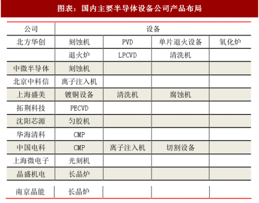 设备国产化率依然较低,但是部分设备已经具备优势。根据 semi 的数据,2016 年中国自制半导体设备达到 12 亿元美元,占比 16%,逐步逐渐上升,但是占比依然较低,按照中国 2016 年 64.6 亿美元的市场规模,其中 52.6 亿美元的设备需要进口。但是部分国产设备已经具备优势,在下游客户处持续获得突破。例如中微半导体在刻蚀设备实力突出,是唯一打入台积电 7 纳米制程蚀刻设备的大陆本土设备商。2017 年 11 月 21 日由中电科电子装备集团有限公司研发的国内首台拥有完全自主知识产权的 200mm cmp(化学机械抛光)设备,进入中芯国际 8 寸大生产线进行产线验证。北方华创 28nm 制程的刻蚀机、pvd、立式氧化炉、清洗机、lpcvd 等设备已处于产业化初期阶段,相关产品已交付客户。同时已有 6 款 12 吋 14nm 制程设备进入客户端开展工艺研发。晶盛的硅片长晶炉已经供应给郑州合晶,上海新昇采购了南京晶能的 3 台长晶炉设备。