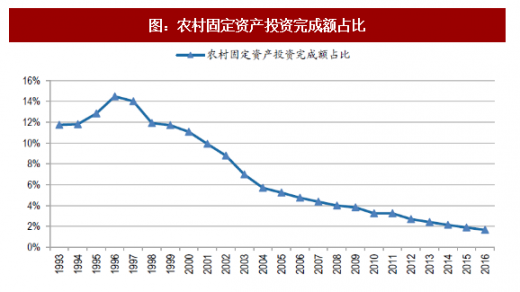 农村固定资产投资增速过去几年甚至连续负增长,未来中国经济增长的潜力之一也是在农村。根据国家统计局的数据显示,我国农村固定资产投资占全社会固定资产投资额的比例从1996年之后逐步下滑,到2016年占比只有大约2%的水平。尽管十三五期间农村基础设施在进一步改进,但空间依然比较大。2017年《国务院办公厅关于创新农村基础设施投融资体制机制的指导意见》(国办发〔2017〕17号)中有明确定性:“由于历史欠账较多、资金投入不足、融资渠道不畅等原因,农村基础设施总体上仍比较薄弱,与全面建成小康社会的要求还有较大差距”。