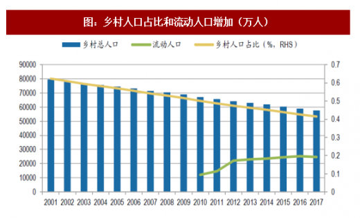农村市场需求量上升的另一层因素是机器换人。我国的人口结构中,农村户籍人口虽然达到了5.77亿人,但是占总人口的比重正在逐步降低,从2001年的62%下滑到了2017年的41.5%。其次,农村人口结构中,大量农民工进城务工,实际上的农村劳动力人口更少,由于劳动力短缺,很多的建设方式逐步采用“机器换人”的模式。例如建筑公共、基建设施等。