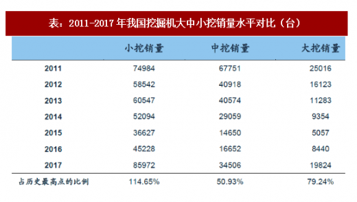 表:2011-2017年我国挖掘机大中小挖销量水平对比(台)