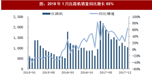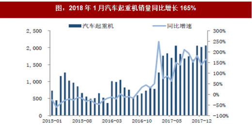 2018 年1 月汽车起重机销量2072 台,同比增加165%,销量超过近三年同期销量之和,相比于工程机械其他设备,销量增速位列榜首。1 月推土机销量638 台,同比增长98%,销量超过前两年单月销量之和,2018 年喜迎开门红。1 月销量1039 台,同比增加65%,创2011 年至今同期最高销量。