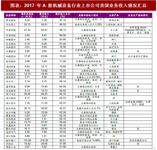 我们全面梳理了 2017 年 a 股机械设备行业上市公司(按申银万国行业 分类)海外业务收入占营业收入比重以及美国业务相关情况,得到以下结论。
