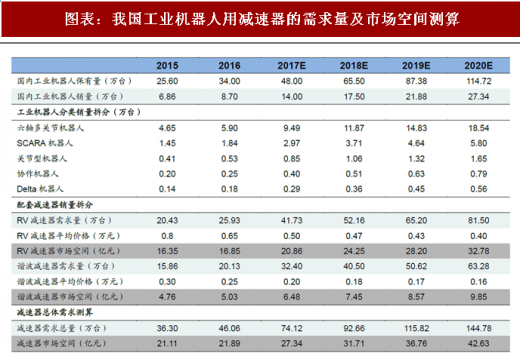 在工业机器人中的应用。对于多关节工业机器人来说,由于负载不同,配套 的减速器类型可能产生差别,但每一个关节部位都需要配套一台精密减速器。因此, 一台通用机器人需要的减速器个数为4-6套。另外,对于已保有的工业机器人,减速 器本身有额定的工作寿命,需要定期更换;而工业机器人的工作寿命一般为8-10年, 期间减速器作为传动、承重部件,磨损是不可避免的。因此,我国当前保有工业机 器人维修保养也需大量的减速器。