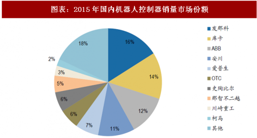 但控制器的核心在于算法要与机器人本体相匹配。目前,国外主流机器人厂商的控 制器均是基于运动控制平台进行自主研发,以保证匹配性,导致国内企业控制器尚 未形成竞争优势。根据ofweek机器人网的数据,2015年国内控制器市场中,发那科、安川、abb占据53%的份额,爱普生、otc等二线企业占据23%的份额。可以说,国产控制机在硬件上与国外差距不大,差距主要是算法和兼容性方面。