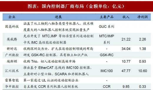 机器人控制器的主要供应商包括国外的几大厂商和国内的固高科技、埃斯顿、广州 数控等企业。从目前的技术来看,国内企业在该领域的布局已经看到了国产突破的希望,其中固高科技的控制器已经涵盖了从三轴到八轴各类型号机器人,技术难度 最大的八轴机器人控制系统实现批量生产。根据高工机器人网统计的数据,固高科 技在pc based控制器领域市占率接近50%。另外,埃斯顿也收购了英国trio,借 此转型高端运动控制方案商,后者是全球运动控制十大品牌之一。根据年报的披露, 2017年埃斯顿运动控制及交流伺服系统业务收入同比增长57%,基于trio的运动控 制完整金沙下载送彩金的解决方案在机械手、3c电子制造设备等行业已经具备了一定影响力。市场规 模方面,根据高空机器人网的数据,2015年中国控制器市场规模达23.2亿元,同比 增长19%,机器人控制器约3.9亿元,占比17%。