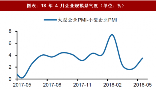 2017q3 到 2017 年底,企业规模景气度指数均值 2.5%, 18 年 2 月企业规模景气度差异创出新高 7.4,主要因北方采暖季期间,小企业明 显被压制。5 月,企业规模景气度差异在 4 月基础上上升至 2.3%,接近均值水平, 主要因大企业的生产经营状况扩张,而小景气度收缩至枯荣线下,小企业的 状况在变差,主要原因可能与信用利差扩大带来的融资端影响传递。
