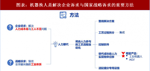 工业机器人本体 300 亿市场空间,是撬动工控自动化万亿空间的关键设备。在大自动化趋势下,机器换人是解决企业诉求与国家战略诉求的重要方法:在企业层面,机器换人能够解决企业人力成本高、工人不足的难题;在国家层面,机器换人能够满足留住全球最完备工业体系的战略诉求。工业机器人是自动化改造过程中的明星产品,企业可以适配不同场景的机器人作为切入流程自动化的钥匙。百亿工业机器人市场,最终可以撬动工控自动化万亿市场空间。