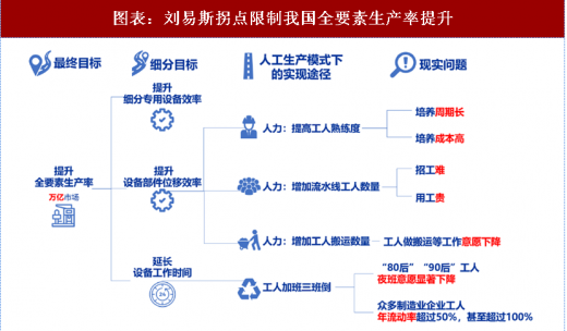 刘易斯拐点限制我国全要素生产率提升,依赖人力劳动的传统制造业模式受到冲击。提升全要素生产力有三大途径:提升专用设备效率、提升部件位移效率和延长工作时间。然而,当今中国制造业企业普遍面临招工难、招工贵、工人培养成本高、工人对工作环境要求提升等难题,人工模式下提升全要素生产力的实现途径困难,改造迫在眉睫。