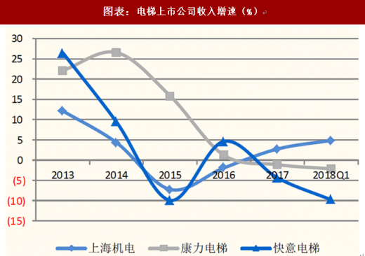 需求减少致竞争加剧,电梯行业进入下行周期。根据康力电梯年报,2017年是国内电梯行业竞争最为激烈的一年。从数据来看,康力17年电梯销量17327台,增速7.3%;营业收入32.8亿,增速1%;归母净利润3.26亿,增速-23%。销量增速>收入增速>利润增速,反映行业进入下行期、市场竞争加剧,产品降价以保份额;市场销售困难,费用增加侵蚀利润。
