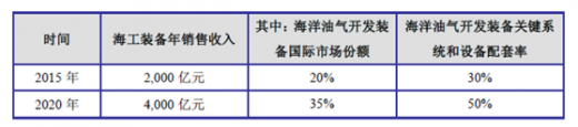 海洋油气资源勘探开发是我国能源战略的重要组成部分,海洋工程装备为其提供装备保障。国家发改委制定的《海洋工程装备制造业中长期发展规划(2011-2020)》为“十二五”到“十三五”期间我国的海工装备市场规模拟定了如下发展目标:
