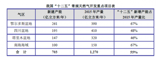 常规天然气勘探开发方面,“十二五”期间将加强四大产气区的天然气产能建设,新建产能合计达703 亿立方米/年,较“十一五”末增长超过120%。