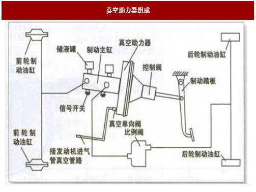 汽车大多使用真空助力器作为制动系统的辅助助力方式,真空助力器通过单向阀与发动机进气歧管相通,当发动机运转时,产生负压,进而在助力器膜片两端形成压力差,膜片在压力差的作用下被推动,从而减轻制动踏板操作力。