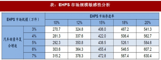 在国内汽车销量复合增速为5%、ehps渗透率为15%的中性假设下,2020年ehps的市场规模为438.5万件,若按照ehps电液泵单价1300元/件计算,ehps电液泵市场空间有望达到57亿元。