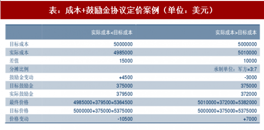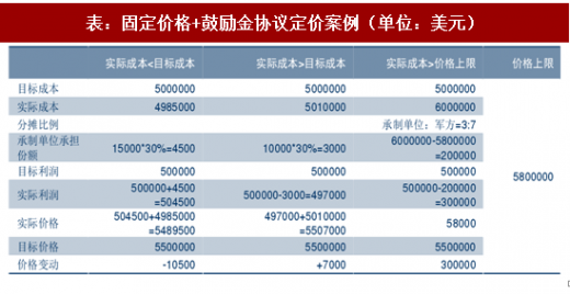 不变固定价格协议:双方当事人在合同签订之前就确定装备价格,除非合同中有明确规定的修改条款,价格在合同履行的整个过程中保持不变。此种定价方法完全将风险转让给了承制单位,军方与承包商的成本差异分摊比例为 0:100%。