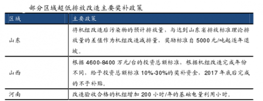 东、中、西部地区改造时限分别为 2017、2018、2020 年,各地政府为促进区域内机组改造,加快达标进度,纷纷出台利用小时奖励、投资总额补贴、减排量补贴等奖补政策,预计 2017-2018 年将迎来燃煤机组超低排放改造高峰,若按单位千瓦改造费用 50-100 元测算,仅考虑装机容量占比约 70-80%的东中部地区未改造机组,年均市场空间将超过 100 亿元。