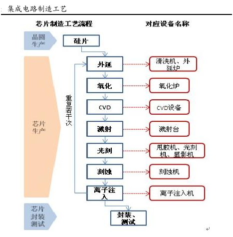 集成电路制造工艺是由多种单项工艺组合而成的,简单来说有四个主要步骤:薄膜制备工艺;图形转移工艺和掺杂工艺。