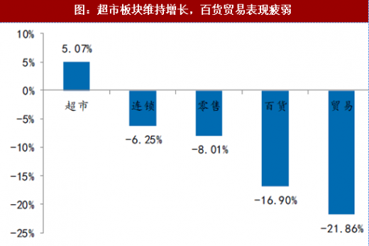 零售二级子板块涨跌分化严重,超市行业实现增长5%,贸易百货表现疲弱,分别下跌16.9%和21.86%。
