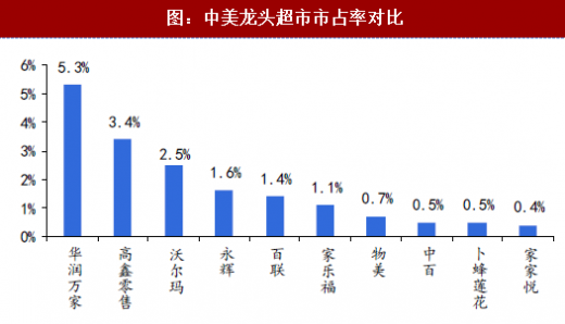 国内超市龙头企业市占率显著低于美国,在行业增速放缓、新零售变革驱动下,拥有资金和资源优势的龙头企业有望进一步提升市占率。